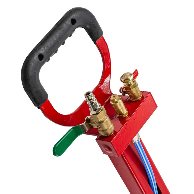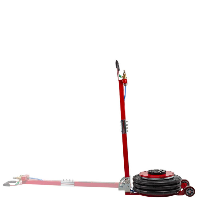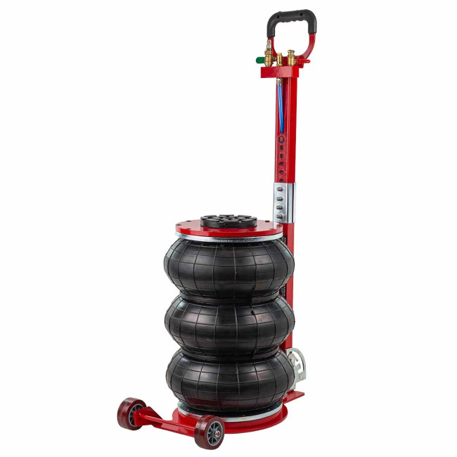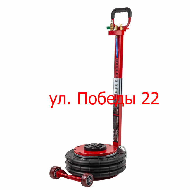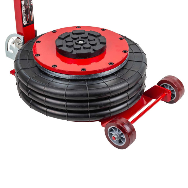 Домкрат автомобильный пневматический с грузоподъемностью до 6 тонн. Максимальная высота подъема 440 мм, уровень подхвата 145 мм. Позволяет производить быстрый демонтаж и установку колес легкового транспорта, а также необходимый местный ремонт подвески, узлов рулевого управления и тормозной системы. Домкрат подкатной имеет грузоподъемность 6 тонн и рассчитан на подключение к компрессору, подающему сжатый воздух под давлением от 6 до 12 бар. Устройство приводится в действие путем открытия крана подачи, расположенного на конце управляющей рукоятки. Конструкция данной модели включает три распорные резиновые подушки диаметром 320 мм.
