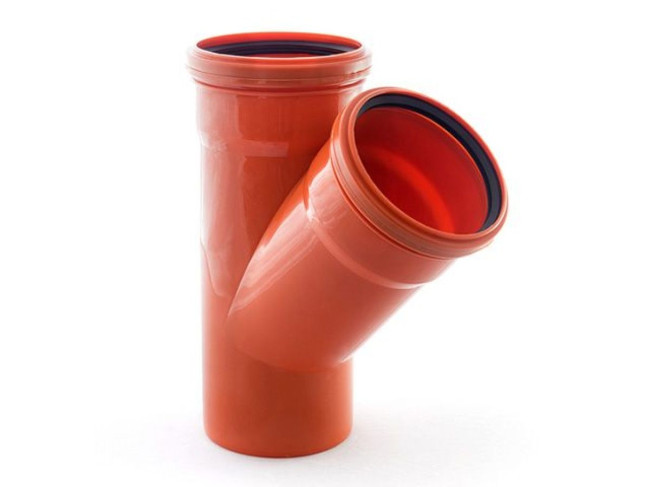 Тройник канализационный для трубы диаметром 110 мм. Имеет выход под трубу диаметром 110 мм под углом 45 градусов. Применяется при монтаже систем наружной канализации.
