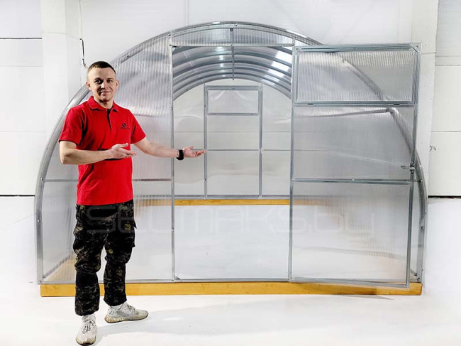 3. Простота сборки. Т.к. дуги в такой конструкции цельные, а не состоят из частей, а торцы уже сварены и в них уже вставлены двери с форточками, то для ее установки Вам понадобится минимум времени и усилий. При покупке же сборной теплицы, люди, как правило, прибегают к услугам монтажников. Что, к слову, совсем недешево: сборка самого простого шестиметрового каркаса обойдется дорого.