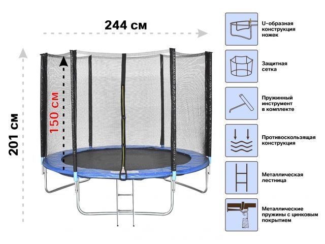 Батут предназначен для прыжков на открытом воздухе. Представляет собой прочную плетёную сетку из полипропилена (прыжковое полотно), натянутую на каркас из гальванизированного металла с защитной сеткой (из полиэтилена) при помощи металлических пружин с цинковым покрытием. Пружины закрыты защитным кожухом из ПВХ толщиной 20 мм. Батут с полным комплектом защиты и с лестницей, позволит безопасно забираться и слезать с батута. Безопасность прыгуна обеспечивается защитной сеткой, которая полностью окружает мат и не позволяет выпрыгнуть из батута при выполнении упражнений, а также мягким кожухом из ПВХ, который полностью закрывает пружины и твердый каркас, тем самым исключает возможность травм. Сделанный из качественных материалов, батут со временем не портится и не выгорает на солнце. Пружины не теряют своей эластичности, а полотно не протирается от интенсивного использования.