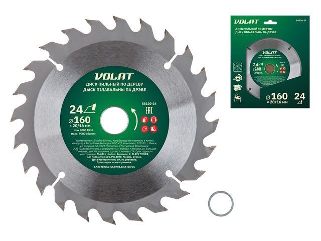 Диск пильный 160х20/16 мм 24 зуб. по дереву ВОЛАТ (твердоспл. зуб)