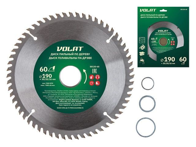 Диск пильный 190х30/20/16 мм 60 зуб. по дереву ВОЛАТ (твердоспл. зуб)