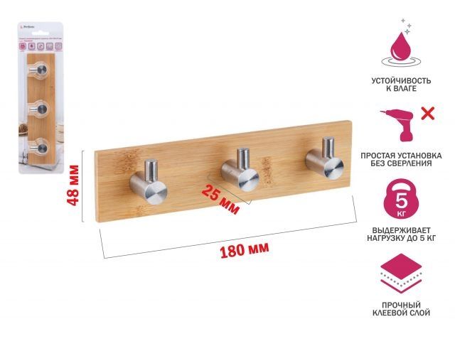 Планка самоклеящаяся 3 крючка PEGASUS, нержавеющая сталь/бамбук, блистер, PERFECTO LINEA