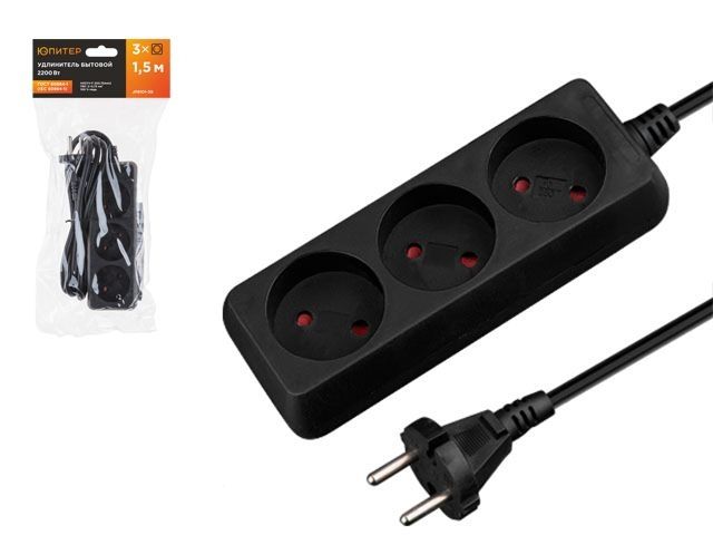 Удлинитель 1,5м (3 роз., 2,2кВт, б/з, ПВС 2х0,75) черный, Юпитер (ЮПИТЕР)