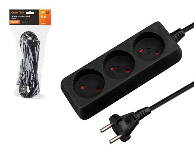 Удлинитель 5м (3 роз., 2,2кВт, б/з, ПВС 2х0,75) черный, Юпитер (ЮПИТЕР)